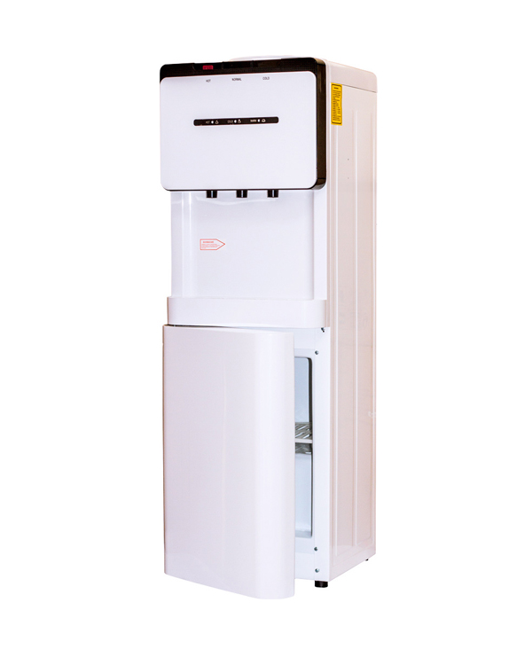 Водный кулер Aqua Work V908 с электронной системой охлаждения, стройным металлическим корпусом и шкафчиком на 14 литров.